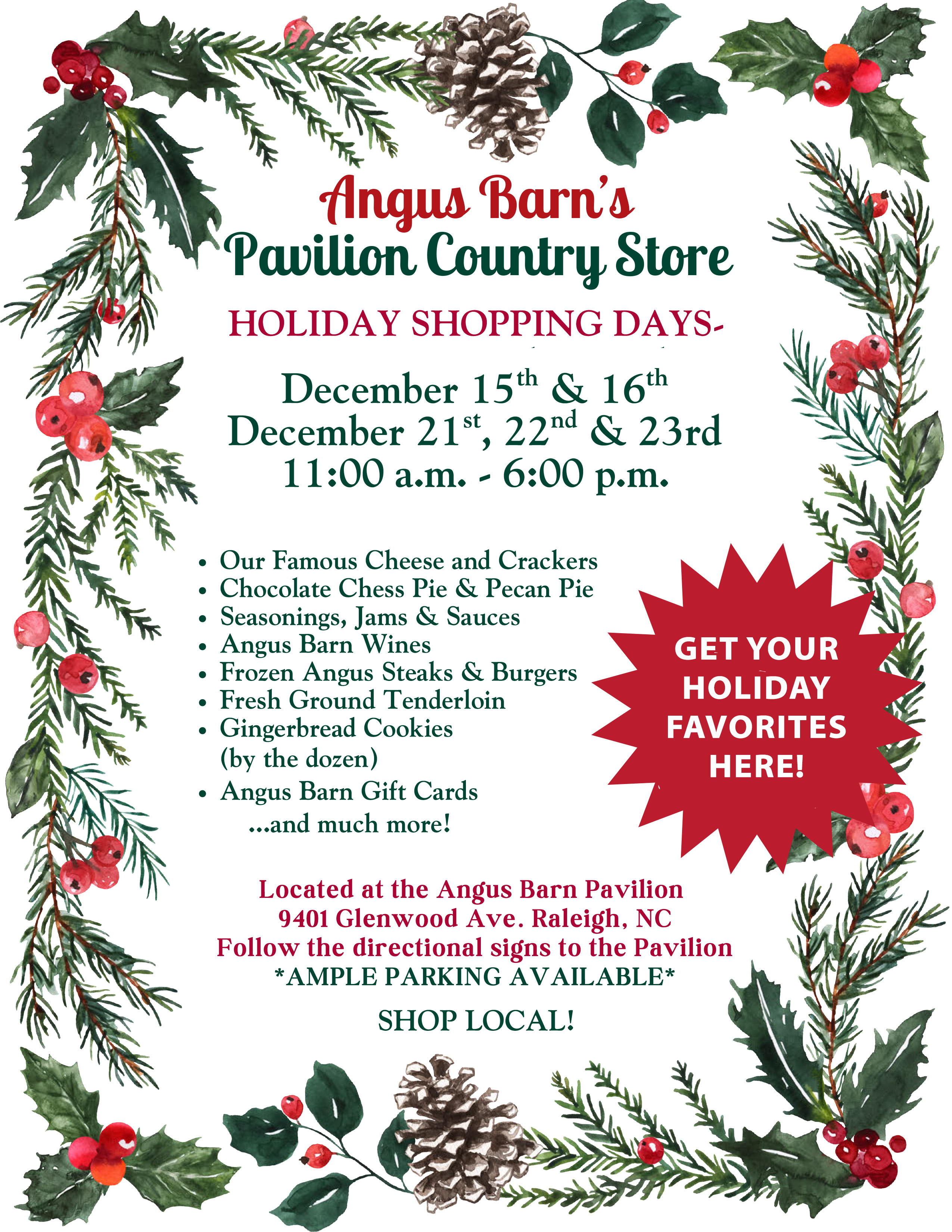 The Angus Barn Steakhouse, a Raleigh icon serving American style cuisine including in-house aged steaks, fresh seafood, local grown vegetables and homemade desserts prepared by Executive Chef Scott James and his culinary staff. The Barn hosts an award winning wine cellar, the famous Wild Turkey Lounge, Meat Locker lounge, private dining tables, banquet rooms and two private event venues: The Pavilion at the Angus Barn & Bay 7 at American Tobacco Campus in Durham, North Carolina.